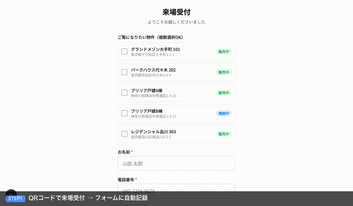 店舗に1枚のQRを掲出するだけ。来場者がスマホでスキャンしてフォーム入力すると、物件・氏名・電話番号がスプレッドシートに自動記録されます。